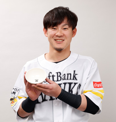 点々模様が特徴的な福岡の伝統的工芸品・小石原焼。オフホワイトのシンプルで洗練されたデザインが食卓にも馴染みやすく、ご自宅用や贈答用に喜ばれること間違いなしの一品です。茶碗の底にはアンバサダー牧原選手の背番号と背ネームが入った、ファンには嬉しいチャーミングなデザインです。