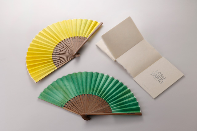 佐賀県の伝統工芸品・名尾手すき和紙の扇子と御朱印帳です。扇子はケースも付いた高級感溢れる一品で、カラーはホークスのイメージカラーのイエローか、柳田選手のイメージカラーのグリーンから選べます!御朱印帳はサイン帳として使うのもおすすめ♪