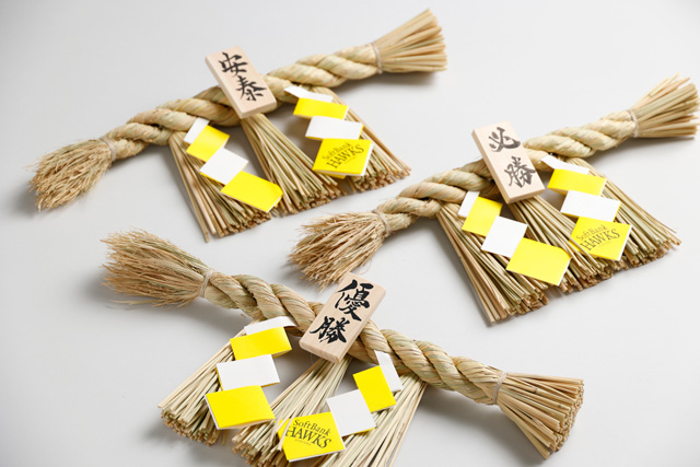 宮崎県の伝統的工芸品・わら細工のしめ縄をホークスカラーの紙垂であしらったオリジナルの一品です。木札の書家による書き入れは、「必勝」「優勝」「安泰」から選べます。「必勝」は、アンバサダーである武田投手のリクエストワードでもあります!