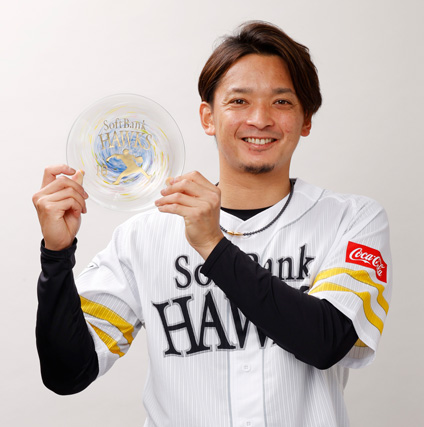 全国的にも有名な沖縄県の伝統的工芸品・琉球ガラス。沖縄の燦燦と輝く太陽をイメージしたレッド、透き通る海をイメージしたブルーのカラーにホークスのロゴが煌びやかに入った限定デザイン器です!アンバサダー柄は東浜投手のプレーシーンがシルエットでデザインされています。