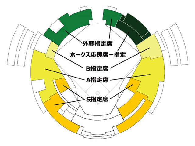 | 席種 |  S指定席、A指定席、B指定席、外野指定席、ホークス応援席-指定のいずれか![]()  |