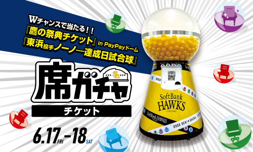 6月17日(金)・18日(土)の2日間限定!観戦当日カプセルトイを回して、カプセルに入った座席で観戦いただける「席ガチャチケット」を販売します。A指定席以上を確約、コカ・コーラシートやバックネット裏の<みずほ>プレミアムシートなど人気席種も対象です!さらに、鷹の祭典2022観戦チケットや東浜投手ノーヒットノーラン達成日の試合球(東浜投手のサイン入り)など素敵な賞品が当たるWチャンスもご用意しています♪