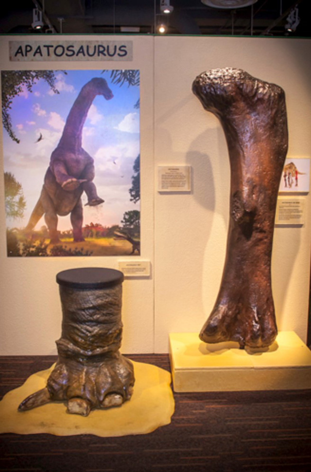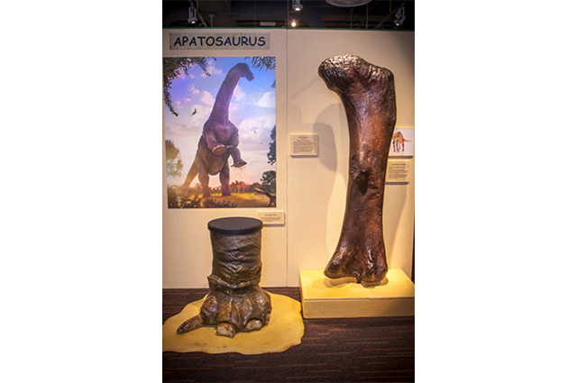 体長22m以上もあったといわれるアパトサウルスの大腿骨と実物大の前足の模型を展示。前足の模型は登ったり座ったりすることができます!アパトサウルスの大きさを肌で感じよう!