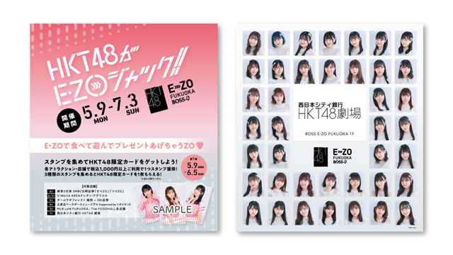 5月9日(月)~6月5日(日)の期間中、BOSS E・ZO FUKUOKAの対象アトラクションや飲食店舗、HKT48劇場をご利用でスタンプをゲット!3種類スタンプを集めると、HKT48がE・ZOをジャック企画限定カードを1枚プレゼントします♪限定カードの中にはなんとメンバーの直筆サインが入ったものも、、?!(カードは40種ランダム)第二弾も6月6日(月)から開始予定です!