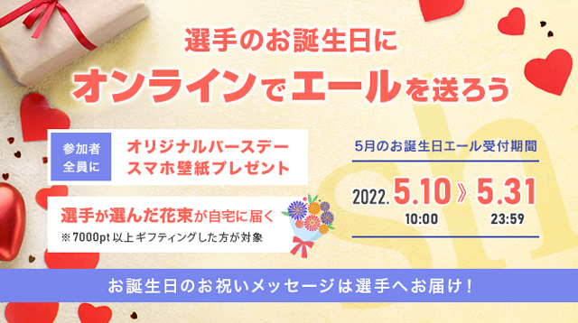 5月生まれの選手にお誕生日エールを送ろう!5月10日(火)~31日(火)の期間、5月生まれの選手へエールを送るギフティングイベントを開催!皆さまからいただいたエールは選手に確実にお届けします。さらに、ご参加いただいた方全員に限定プレゼントや選手が選んだ花束のお返しも。シーズンを戦う選手たちへたくさんのエールのプレゼントをお待ちしています!