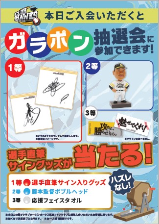 当日入会いただい方限定!アンケートに回答で『選手の直筆サイングッズ』が当たるハズレなしのガラポン抽選会に参加できます!さらに、中学生以下の入会で「ジュニアキャップ」もプレゼント☆