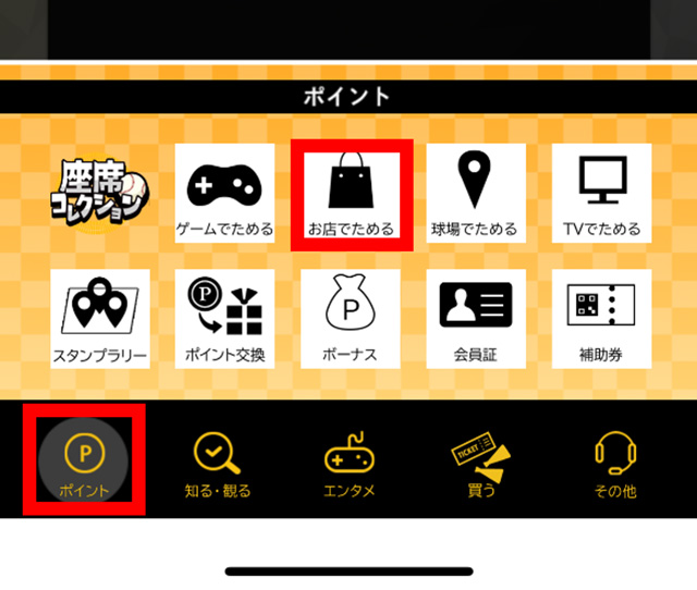 (2)アプリトップ画面から、左下の「ポイント」→「お店でためる」の順にタップ