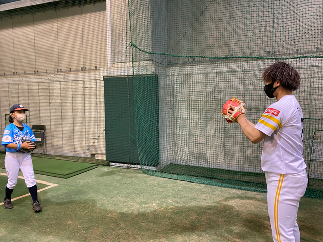「捕球後の正確な送球が苦手なので、そのコツを教えてほしい」という悠音さんのリクエストに応え、早速練習が始まります!「いいねいいね!」「失敗しても大丈夫だよ!」と今宮選手は優しく声をかけてくれます。