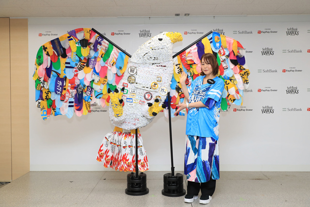 しばたみなみさんは「各球場でファンの皆様からメッセージも書いていただき、それを羽の後ろに配置し、選手の背にファンの思いを込めてという意味合いを持たせました」と作品について説明。「ファンの思いも一つに。勝利に向かって大きく羽ばたいてほしい」との願いも込められているそうです。