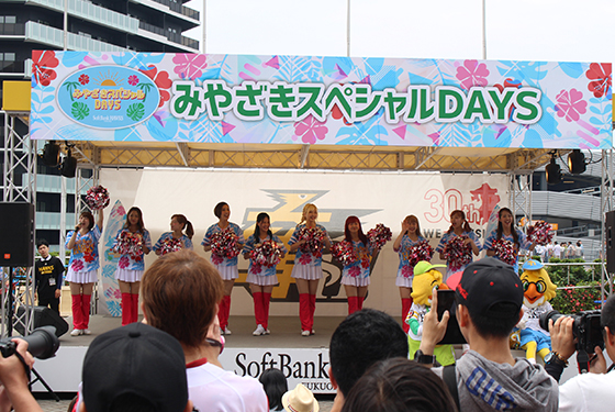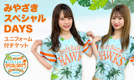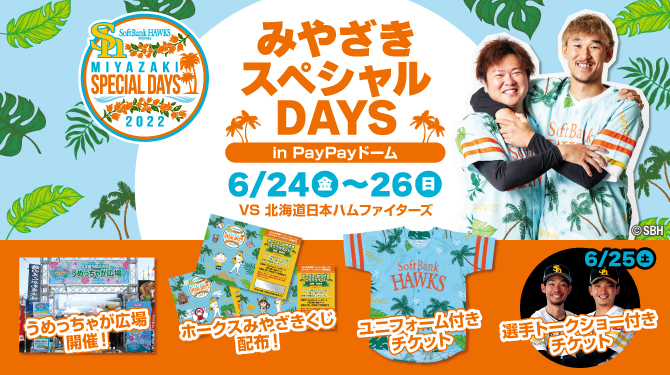 6月24日(金)~26日(日)北海道日本ハムファイターズ戦の3日間では、南国リゾート宮崎を体感できるイベント「みやざきスペシャルDAYS」を3年ぶりに開催!宮崎ならではのステージイベントや特産品のふるまいなどを行います。さらに、南国宮崎をイメージした特別ユニフォームが付いたチケットも好評販売中!ホークスのキャンプ地でもある宮崎とホークスファンの絆を深めるイベント「みやざきスペシャルDAYS」で南国気分を味わおう!