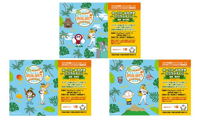 くじはスクラッチ式になっており、券面は日程ごとに高千穂町・宮崎市・都城市の各マスコットが描かれた可愛らしいデザインとなっております。