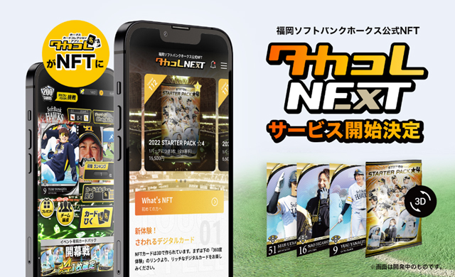 その他、公式カードコレクションアプリ「ホークスカードコレクション・タカコレ」で提供しているデジタルカードもNFTとして「タカコレNEXT」で順次販売予定です。「ホークスカードコレクション・タカコレ」のカードが、NFTの技術によって実物のカードと同じように一枚一枚の価値を証明できるようになります。さらに、「ホークスカードコレクション・タカコレ」内での『今日の3人+』やマイチームでの設定、カードホルダーとの連携なども予定しています。