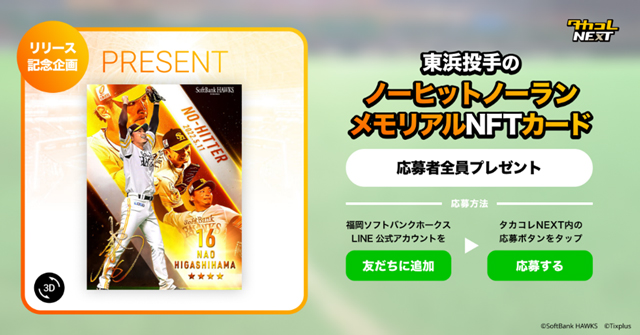 「タカコレNEXTで、僕のノーヒットノーラン達成記念NFTカードが登場します。かっこいいデザインとなっていますので、ぜひお楽しみください!」