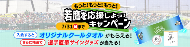 ホークス筑後ファンクラブでは、6月1日(水)から「ホークス筑後ファンクラブもっと!もっと!もっと!若鷹を応援しよう!キャンペーン」を実施します。期間中に新規入会いただいた方全員に、キャンペーン特典としてオリジナルクールタオルを1枚プレゼントします。さらに、抽選で若鷹選手の直筆サイングッズをプレゼント!ホークス筑後ファンクラブに新規入会して、若鷹選手のサイングッズをゲットしよう♪