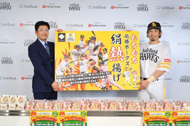 5月29日(日)、「三好食品工業株式会社」様より「ホークスなめらか絹とうふ三連勝」と「もちもち必勝ホークス絹熱揚げ」を贈呈いただき、福岡PayPayドーム内プレスカンファレンスルームで贈呈式が執り行われました。