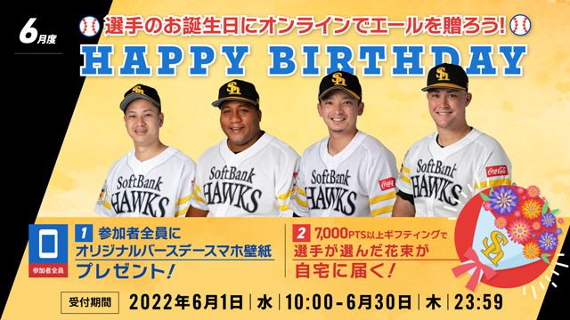 6月生まれの選手にお誕生日エールを送ろう!6月1日(水)~30日(木)の期間、6月生まれの選手へエールを送るギフティングイベントを開催!皆さまからいただいたエールは選手に確実にお届けします。さらに、ご参加いただいた方全員に限定プレゼントや選手が選んだ花束のお返しも。シーズンを戦う選手たちへたくさんのエールのプレゼントをお待ちしています!