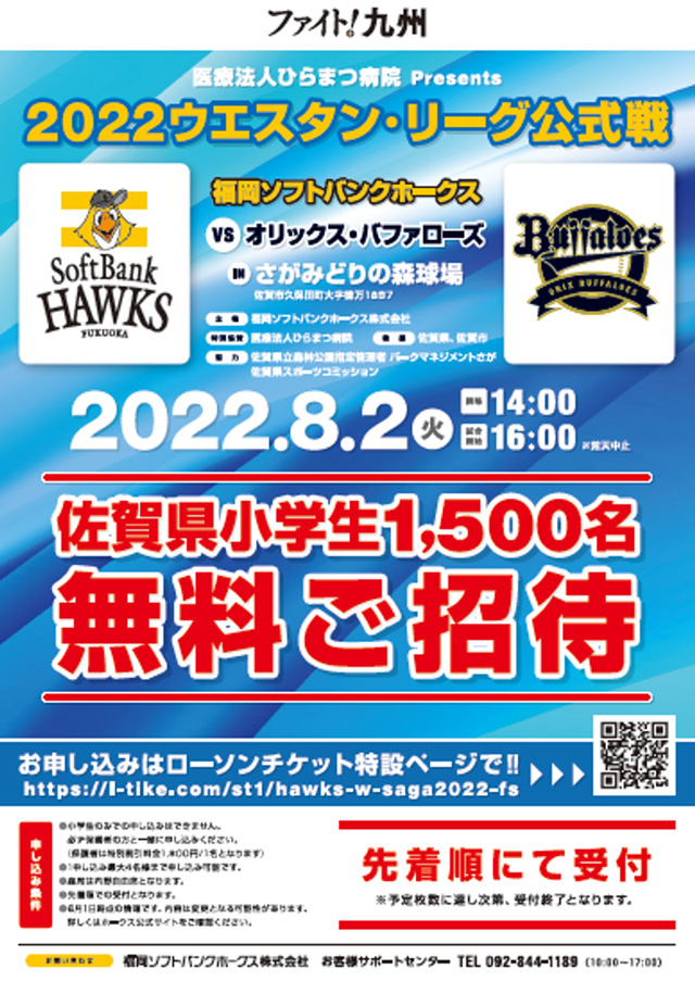 さらに、地域の子供たちにスポーツの楽しさを伝えることを目的に、佐賀県内小学生1,500名を無料でご招待いたします。そのほか、ホークスが九州を元気にする「ファイト!九州」の活動も行いますので、ぜひこの機会にプロ野球選手のプレーを間近でお楽しみください!