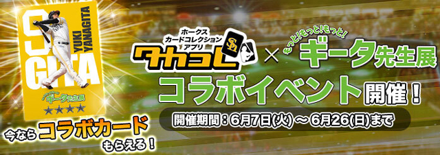 ホークスカードコレクション・タカコレでも「もっと!もっと!もっと!ギータ先生展」開催を記念してギータ先生展コラボカードが期間限定で登場!また、イベント期間中にタカコレにログインいただいたユーザー全員に、「もっと!もっと!もっと!ギータ先生展」のビジュアルをモチーフにした特別な☆4カードをプレゼント!