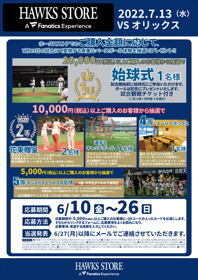 7月13日(水)・14日(木)に福岡PayPayドームで行われるオリックス・バファローズ戦は、HAWKS公式オンラインストア・HAWKS STORE HOME(旧 PayPayドーム店)を運営するオフィシャルパートナー「Fanatics Japan G.K.(ファナティクス・ジャパン合同会社) 」協賛試合となります。そこで、グッズなどの購入金額に応じて、7月13日・14日の試合に始球式や花束贈呈、選手とのキャッチボールなどスペシャルな体験にご招待するキャンペーンを実施!