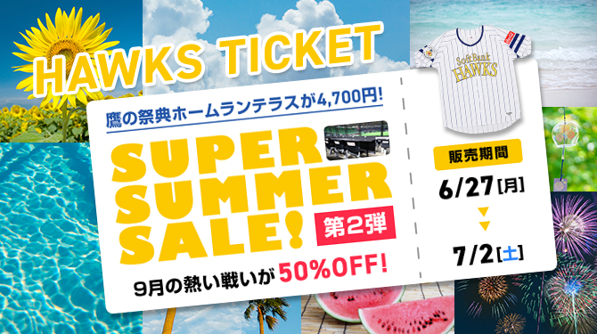 6月27日(月)から7月2日(土)までの6日間限定販売!入手困難な鷹の祭典のホームランテラスを含む対象試合の指定席が最大50%OFFとスーパーおトクなセールです♪枚数限定販売につきご購入はお早めに!
