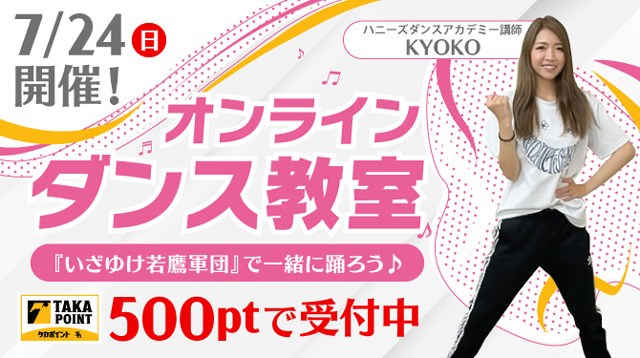 タカポイントでは、7月24日(日)に開催する「オンラインダンス教室」の参加者をポイント交換にて募集中です。