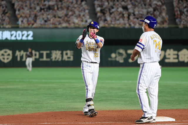 打線は8回裏に満塁のチャンスから周東佑京選手がレフトへタイムリーヒットを放ちました。ここまで打率.354と打撃好調を維持しています。「とにかく繋ぐ意識で打席に立ちました。チャンスで一本打つことができたことは良かったです」とコメント。さらに4月上旬以来の一軍昇格となった野村大樹選手は代打でヒットを放ち、「相手投手が速球派で、早くタイミングをとるイメージでスイングを仕掛けにいきました。とにかくチャンスメイクできたことは良かったです。もっと勝利に貢献できるように頑張っていかなければいけないと強く思った一日となりました」と振り返りました。