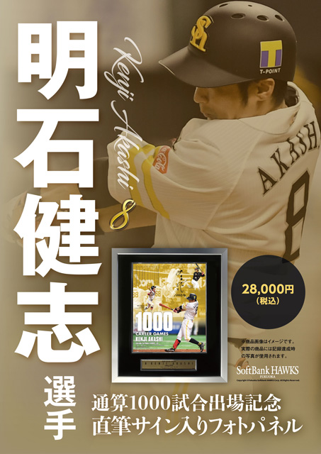 6月24日(金)の北海道日本ハムファイターズ戦で明石健志選手が、通算1000試合出場を達成し、それを記念した限定アイテム(シリアルナンバー入り)を販売します。オリジナルデザインフォトに本人直筆サインが書き込まれます。ユーティリティプレーヤーとして常勝軍団を支え続け、ホークス一筋19年目に到達した1000試合出場を祝するメモリアルアイテムです。