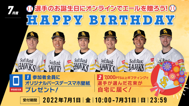 7月生まれの選手にお誕生日エールを送ろう!7月1日(金)~31日(日)の期間、7月生まれの選手へエールを送るギフティングイベントを開催!皆さまからいただいたエールは選手に確実にお届けします。さらに、ご参加いただいた方全員に限定プレゼントや選手が選んだ花束のお返しも。シーズン中盤も熱い戦いを続ける選手たちへ、たくさんのエールのプレゼントをお待ちしています!