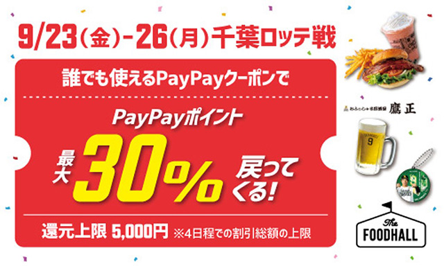 〇PayPayの利用で最大30%戻って来る!:PayPayアプリ内で事前にクーポンを取得した後、対象加盟店で「PayPay」を使ってお支払をすると、決済金額の最大30%(期間中加算上限:5,000円)のPayPayポイントが後日加算されます。