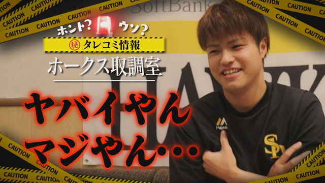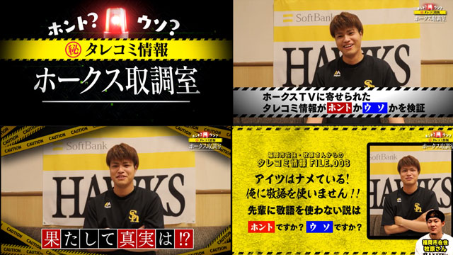 ホークス公式動画チャンネル「ホークスTV」では、7月1日(金)から新番組「(秘)タレコミ情報 ホークス取調室」の配信をスタート!選手にまつわる「これ、ホント?!」という噂や目撃情報を皆さんに代わって直接確かめます。初回は甲斐野央投手へのタレコミを調査。Twitterや選手から寄せられた3つの疑惑を確かめるべく本人を直撃します。選手に確かめてみたいタレコミ情報も募集中!