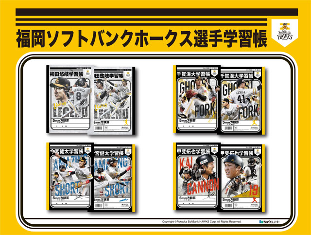 ショウワノート株式会社から「福岡ソフトバンクホークス選手学習帳」が発売!選手の勇姿が掲載された5mm方眼罫ノートは十字リーダー付きでお子様も使いやすい仕様です。ノートを使いながら、一緒にホークスをお応援しましょう!