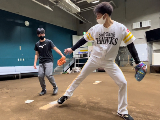これまで自分なりのスタイルでピッチング練習をしてきた智耶さん。自分の今の投球フォームはどうか、どのようにすればもっといい球が投げられるか、選手から直接アドバイスを受けるため、セレモニアルピッチの約1か月前に、予行練習としてPayPayドームにやってきました。そして、リリーフエースとして活躍する憧れの又吉克樹投手からレクチャーを受けることに。