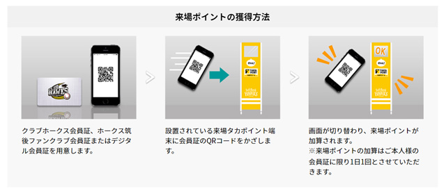 クラブホークス会員証・タカポイントカード・筑後ファンクラブ会員証・デジタル会員証のうち、どれかお一つご準備ください。