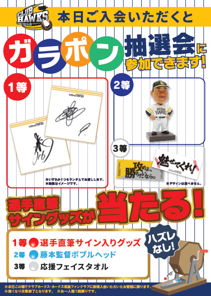 当日、ホークス公式ファンクラブ クラブホークスの新規入会受付を行います!年会費がおためし価格でとってもおとくな「おためしプラン」実施中!ぜひこの機会にクラブホークスへ入会しよう♪「おためしプラン」詳細はこちら