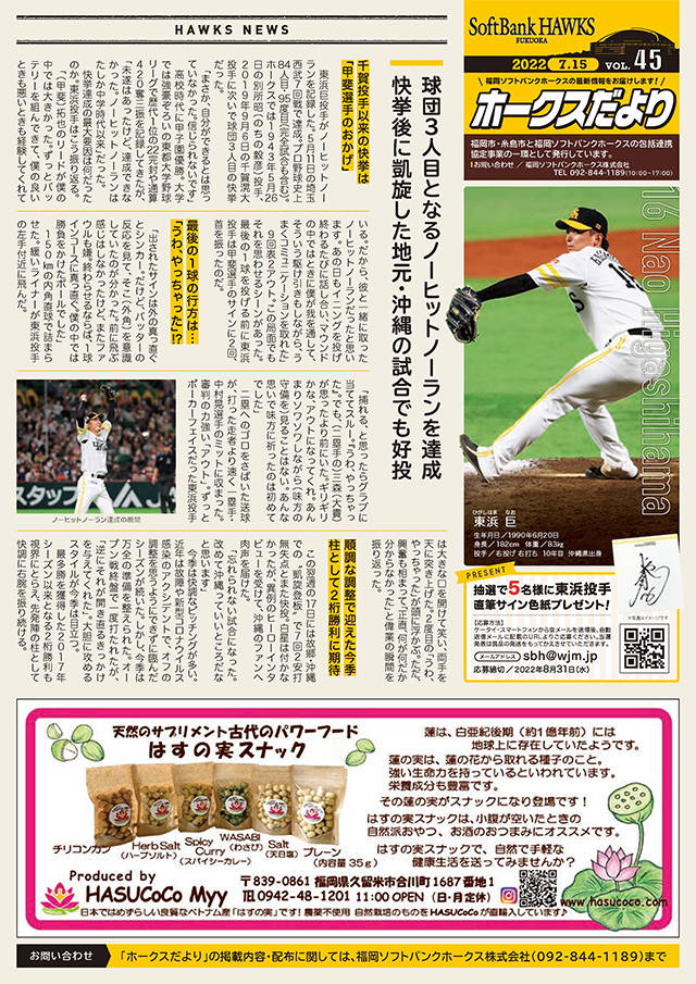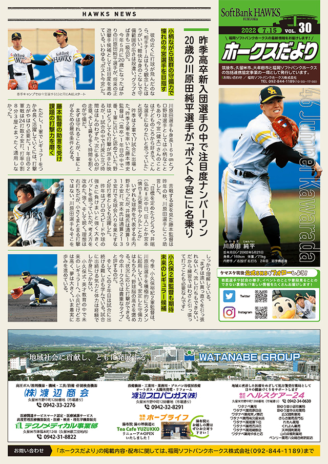 7月号の福岡市・糸島市版は東浜投手、筑後市・久留米市・大牟田市版は川原田選手を特集した内容でお届けします。