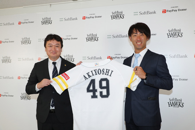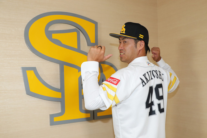 7月19日(火)、秋吉亮投手の入団会見がPayPayドーム内のプレスカンファレンスルームで行われました。秋吉投手の背番号は「49」です。