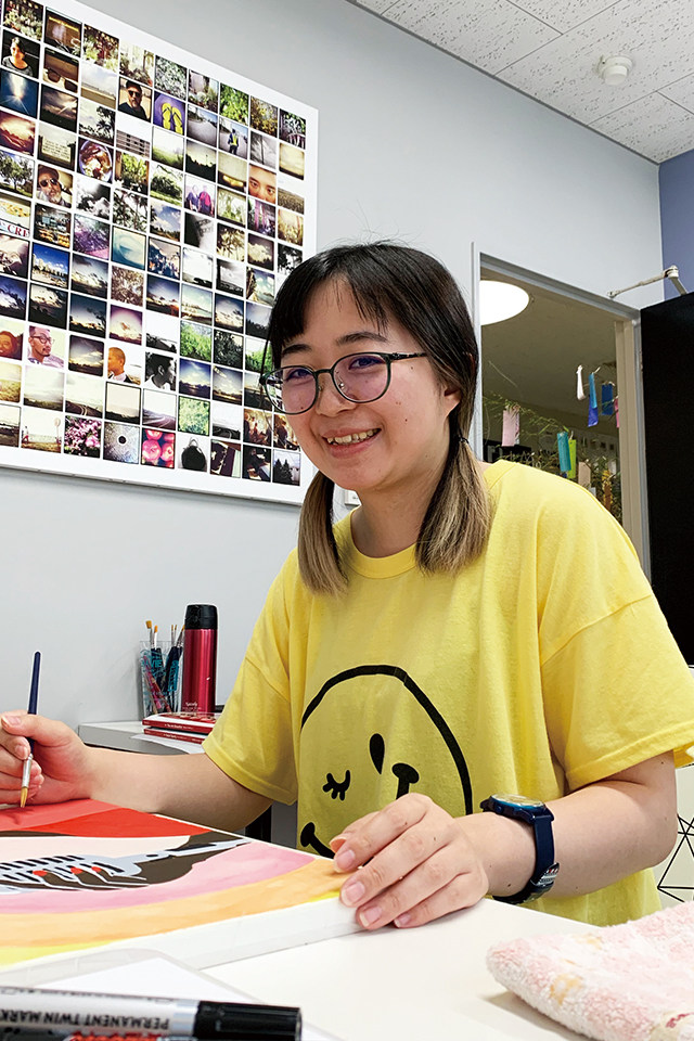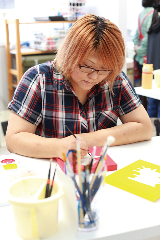 彼女が描く作品は絵画だけにとどまらず、布、粘土、段ボール等色んなものとコラボレートされた作品。その幅広い作風は、彼女の持つ探究心の賜物。彼女の作るアートから目が離せない。