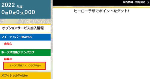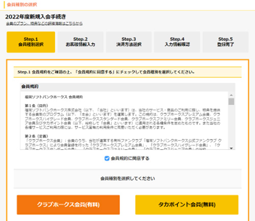 URL先では会員規約に同意後、「クラブホークス会員(有料)」か「タカポイント会員(無料)」いずれかご希望の会員を選択してお手続きを進めてください。