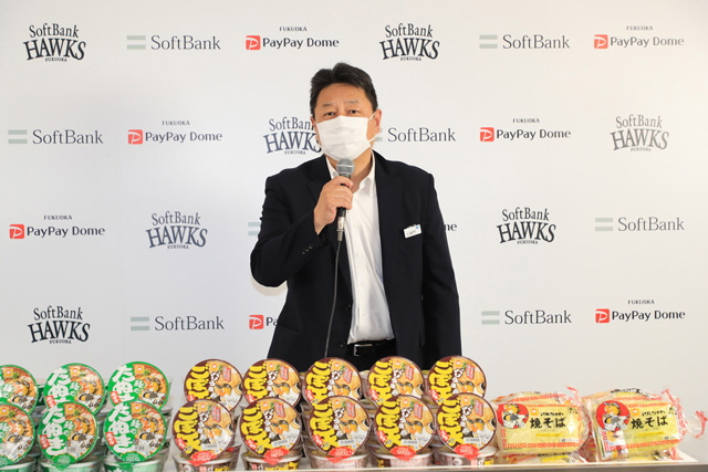 いずれもホークス応援パッケージの「マルちゃん 赤いきつねうどん」「マルちゃん 緑のたぬき天そば」「マルちゃん バリうま ごぼ天うどん」「マルちゃん 焼そば3人前」「ふっくらごはんが炊けました5食パック」をチームに贈呈いただきました。