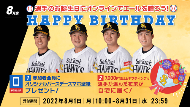 8月生まれの選手にお誕生日のエールを送ろう!8月1日(月)~31日(水)の期間、8月生まれの選手へエールを送るギフティングイベントを開催します。参加は簡単!専用サイトからメッセージとポイントを投稿いただくと、あなたからのエールを選手にお届けします。さらに、イベントに参加された方全員に限定プレゼントや、選手が選んだ花束のお返しも。選手たちへたくさんのエールのプレゼントをお待ちしています!