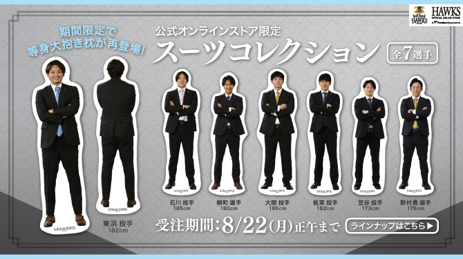| 【受注】等身大抱き枕(全7選手) | 25,000円 | 東浜投手・ 石川投手・ 柳町選手・ 大関投手・ 板東投手・ 笠谷投手・ 野村勇選手 |