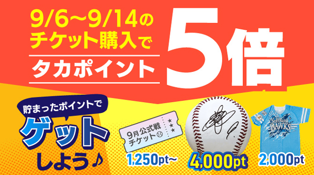終盤戦期間中はタカポイントがとにかくおトク!対象試合のチケット購入時のタカポイント加算が通常の5倍に!さらに、9月チケットのポイント交換50%OFFを開催中!貯まったポイントを使って、球場でもっと!終盤戦を楽しもう!