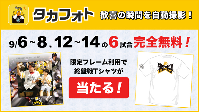 試合観戦中のお客さまを自動で撮影し、応援に熱中する最高の瞬間をメモリアルフォト(記念写真)として提供するアプリ「タカフォト」が、終盤戦6試合完全無料でご利用いただけます。また、終盤戦限定フレームも登場!終盤戦フレームを設定した写真をご購入(無料)いただくと終盤戦Tシャツが当たるキャンペーンも開催!
