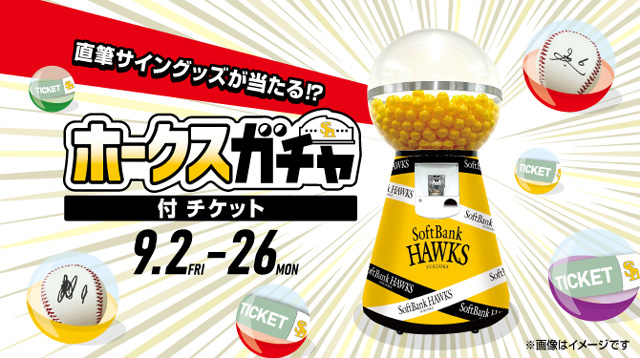 優勝争いが過熱するシーズン終盤戦を球場でもっと!盛り上げよう!9月の対象試合で、選手直筆サインボールやパーソル クライマックス パのチケットなどが当たる「ホークスガチャ」チケット、3名以上のグループ観戦でBOSS E・ZO FUKUOKAのお好きなアトラクションが1回実質無料で利用できるクーポンが付いた「グループ割チケット」を、タカチケットで8月26日(金)10:00から枚数限定販売します。