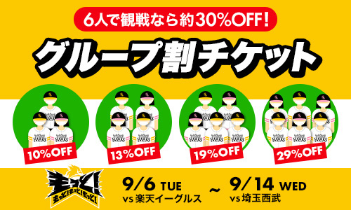 A指定席が購入枚数に応じて割引になるおトクなチケット「グループ割チケット」。E・ZOアトラクション無料クーポン(通常1枚2,000pt)が半額の1,000ptで交換できる特典付き♪仲間を誘って、終盤戦の熱戦とBOSS E・ZO FUKUOKAのアトラクションで、9月の一日をもっと!楽しみつくそう!