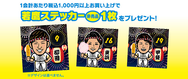 | 概要 | 1,000円(税込)以上の商品をご購入のお客様に「若鷹ステッカー」をプレゼント(上限1枚) |