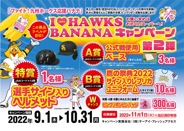 今年も九州全県のスーパー等各所でホークス応援バナナが発売!このバナナはホークスの地元、九州をもっと元気にしたいという思いで発売が開始されており、売上金の一部が「認定NPO法人ハッピーマンマ」に寄付され、「乳がん早期発見のための啓発」や「乳がん患者様と御家族のケアおよびサポートの充実」に役立てられます。毎日の朝食に、おやつに、ホークス応援バナナを食べて九州を盛り上げよう!