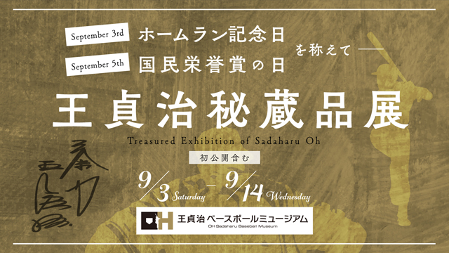 9月3日「ホームラン記念日」、9月5日「国民栄誉賞の日」を記念して、BOSS E・ZO FUKUOKA 4F「王貞治ベースボールミュージアム Supported by リポビタンD」にて、9月14日(水)までの期間限定で「王貞治秘蔵品展」を開催します。当時の王会長の偉業を称えるとともに、ホームランや国民栄誉賞にまつわる品々や初公開のものを展示します。常設展示では見ることのできない貴重な展示が盛りだくさんですので、ぜひご越しください!