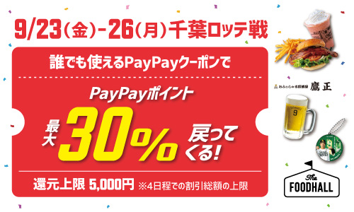 9月23日(金)~26日(月)の千葉ロッテ戦は、PayPayクーポンを使っておトクに観戦しよう♪アプリからクーポンをダウンロードし、PayPayを使ってグッズを購入すると、PayPayポイントが最大30%戻って来るキャンペーンを実施します!