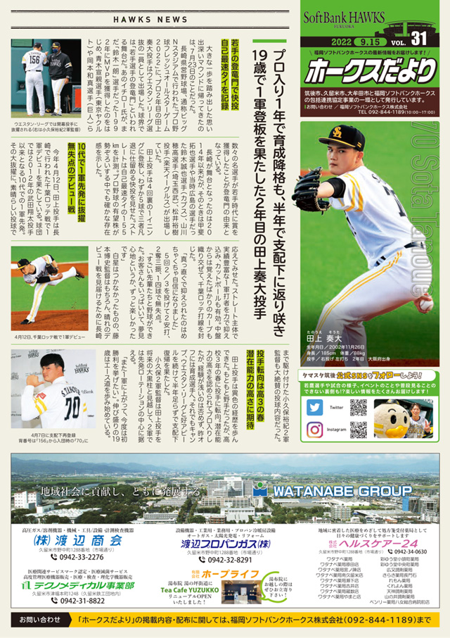 9月号の福岡市・糸島市版は牧原大成選手、筑後市・久留米市・大牟田市版は田上奏大投手を特集した内容でお届けします。